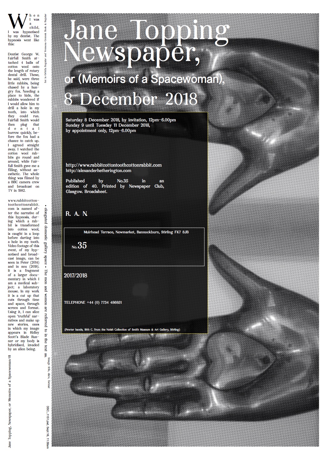 She Was a VisitorTopping, Jane and Hetherington, Alex (2018) She Was a Visitor. No 35 Project Space, Stirling, Scotland, 8-9 December 2018 [Show/Exhibition] |