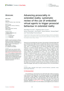 Advancing Prosociality in Extended Reality: Systematic Review of the Use of Embodied Virtual Agents to Trigger Prosocial Behaviour in Extended RealityYousefi, Mamehgol, Crowe, Stephanie, Hoermann, Simon, Sharifi, Mos, Romera, Alvaro, Shahi, Ahmad and Piumsomboon, Thammathip (2024) Advancing Prosociality in Extended Reality: Systematic Review of the Use of Embodied Virtual Agents to Trigger Prosocial Behaviour in Extended Reality. Frontiers in Virtual Reality, 5. ISSN 2673-4192 |