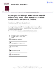 Co-design is Not Enough: Reflections on Creative Collaborative Public Sector Innovation to Deliver Net Zero Policy Outcomes in ScotlandBroadley, Cara, Prosser, Zoe and Stewart, Lydia (2025) Co-design is Not Enough: Reflections on Creative Collaborative Public Sector Innovation to Deliver Net Zero Policy Outcomes in Scotland. Policy Design and Practice. pp. 258-271. ISSN 2574-1292 |