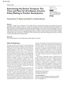 Summoning the Genius Temporis: The Time and Place for Arts-Based, Creative Policy Making to Further Social JusticeFoster, Victoria, de Andrade, Marisa and Raman, Sneha (2025) Summoning the Genius Temporis: The Time and Place for Arts-Based, Creative Policy Making to Further Social Justice. Qualitative Inquiry. ISSN Print: 1077-8004; Online: 1552-7565 |