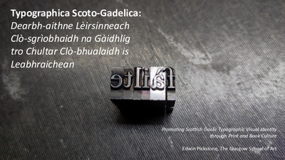 Typographica Scoto-Gadelica: Dearbh-aithne Lèirsinneach Clò-sgrìobhaidh na Gàidhlig tro Chultar Clò-bhualaidh is Leabhraichean / Typographica Scoto-Gadelica: Scottish Gaelic Typographic Visual Identity through Print and Book CulturePickstone, Edwin (2025) Typographica Scoto-Gadelica: Dearbh-aithne Lèirsinneach Clò-sgrìobhaidh na Gàidhlig tro Chultar Clò-bhualaidh is Leabhraichean / Typographica Scoto-Gadelica: Scottish Gaelic Typographic Visual Identity through Print and Book Culture. In: Seòmar Shomhairle, SMO, Research Seminar Series, 3 December 2025, Sabhal Mòr Ostaig, Isle of Skye, Scotland. |
