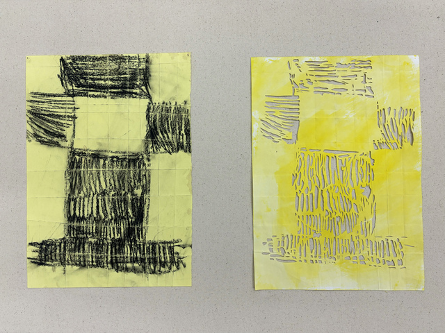 | Abstract: | Untitled (Reflection) Paper 24/10/24 – 31/10/24 Paper was an exhibition curated by Dora Padfield and Liv Fox. Following an open call for work on or about paper, the exhibition included a proposed work which I wanted to make. This piece of work (artefact) was developed to respond to underlying research questions which underpin my current and ongoing practice. My practice-based research asks: In what ways do specific repetitive and process-driven mark-making strategies foreground and challenge the meditative, durational aspects of artistic production? How does the strategy of employing iterative mark-making techniques allow for exploration of persistence, variation and error within painting, and what does this reveal about the role of process in contemporary abstraction? In order to address these key lines of questioning with a view to contributing new knowledge to the field(s) of contemporary painting, the following were considered in the making of the work for the exhibition. - Definitions of durational looking and the pensive gaze The way that Untitled (Reflection) responds to these concerns can be identified through the narrative of its making. I had previously been gifted a work on paper by the artist Dora Padfield. Her work focuses on abstracting signs and motifs from the built environment and she uses these to develop abstracted works. Untitled (Reflection) reflects on Dora’s original charcoal work (also Untitled) through a process of carefully re-enacting the abstracted source material through close observation and then transposes it to a new medium. Rather than a copy or re-presentation, this new work is an iteration or version of Padfield's work, offering up a new looking experience. To develop my work, the source material was focused on visually for prolonged periods of time to better comprehend the composition, through consideration of the markmaking order whjich would have been required to arrive at the finished abstracted composition. This activity constituted an interpretive rewinding of the making process, which was then re-enacted. The two works on paper were exhibited together on a single OSB panel. The resulting single 'work' offered a dual viewing experience. The abstract motif now encouraged an oscillating gaze between the paper pieces. The viewing experience was such that individuals could look for the correspondences between the pieces, could notice errors or moments when one work departed from the other, whilst the clear strategies of making (placing pigment on paper and cutting through paper) were also made clearly visible. |