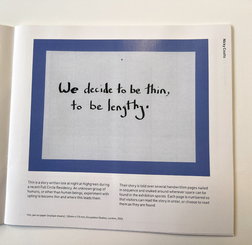 | Abstract: | ‘Thin’ is an artwork made during a two-week residency in November 2024 as part of ‘Full Circle’ at VARC (Visual Art in Rural Communities). It was exhibited at VARC in September 2025. This mini residency followed a year-long residency in 2009 supported by the same organisation. The residencies were aimed at artists unused to living and working in rural settings. Involving local communities was not mandatory but supported and encouraged. In 2009 Coutts made a series of films involving re-enactment. ‘Passing Place’ (2009), set at a remote crossroads in Northumberland near to VARC, involved scenes from six feature films, where significant moments occur at crossroads. Each was re-enacted by local people who live or work nearby and know the location well. Notes were made relating to these filming sessions where participants knew the landscape well, but not the part they were now playing within it. These notes have more recently been developed into a book titled ‘Understudies’. They were written in an effort to engage with an unfamiliar place and in acknowledgment of knowledge gaps. Over the initial residency year this writing sought to question the value of an ‘incomer’s’ knowledge, looked at how it might be possible to write of a place you have no ties to. It also explored where knowledge lies. To do so fictional communities were formed who were getting to know the idea of place and humans anew. The artwork ‘Thin’ is a text work based on these original notes made for ‘Understudies’. It comprises a printed text broken down into individual short stanzas exhibited in a sequence deliberately broken up by other works in the exhibition. It asks audiences to be mobile and to find the continuing text if desired. ‘Thin’ contributed to the exhibition’s accompanying publication ‘Full Circle’ which includes all artists’ work in the exhibition. |