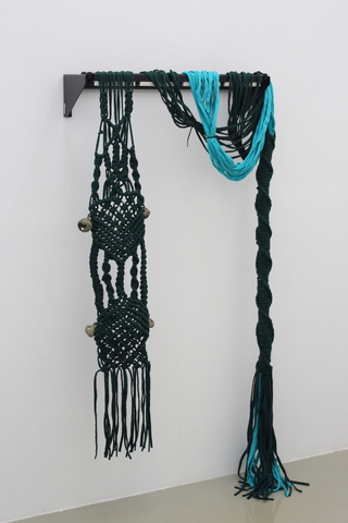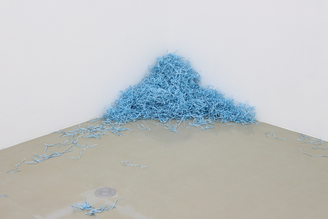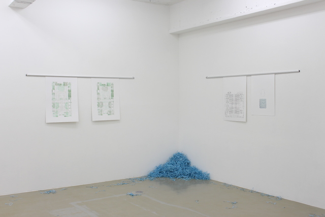 The two sculptures in the exhibition engage with the same themes. 'Irrational Cabinet (Open Rack 3)' uses a readymade rack, often used for home networking, in conjunction with recycled textiles, forming a complex macramé knot pattern. This work materialises the historical connection between the countercultural movement and the development of personal computing in Silicon Valley. 'System/360 Principles of Operation (Working from Home)' is a printed, dyed and shredded version of International Business Machine's (IBM) manual of the same title. The IBM System/360 was one of the first computers to consider the operators 'environment and transformed how we consider computing for personal, business and home use. In this sculpture, shredded paper moves throughout the gallery, echoing the insidious nature of digital structures.