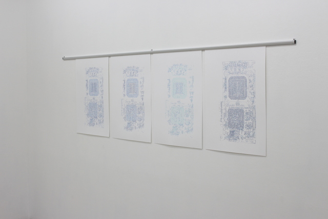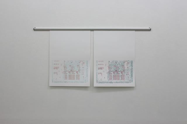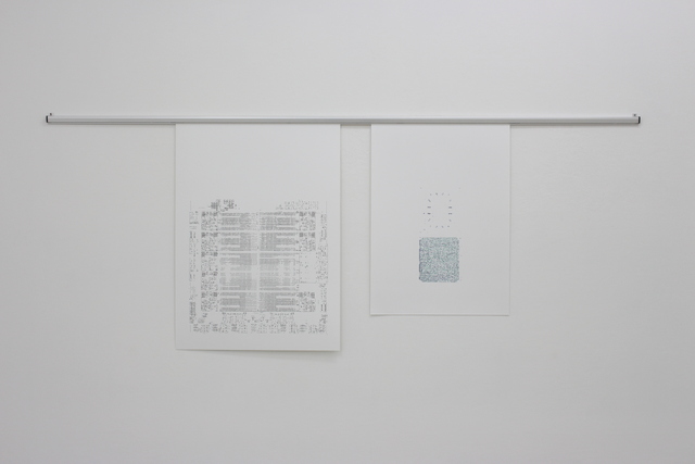 'Interference' is a solo exhibition at Yoshimi Arts, Osaka. The drawings and two sculptures that make up the exhibition examine the shared history of textiles, craft and computer technologies. 'Interference', the drawings from which the show takes its title, employ a range of computer-based processes and are created with a digital pen plotter to establish a reciprocal exchange between the artist and technology. The original photographs of computer circuitry are transformed into a series of fragmented lines, reminiscent of frayed thread, from an intricate, mechanical system. The series is displayed on a rack system to evoke the processes of circuit design in the early digital age, when it was still paper-based.