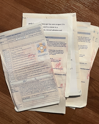 The script was printed onto the artist’s own NHS Scotland prescription forms. Through this material intervention, the work stages allergy as both physiological condition and metaphor for institutional friction, situating the archive and gallery as sites of exposure, illness and reaction.