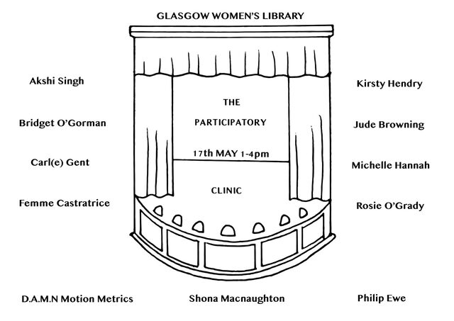 Format: Live spoken word performance. Duration: 20mins Presented within Shona Macnaughton’s The Participatory Clinic at Glasgow Women’s Library alongside invited artists and contributors.