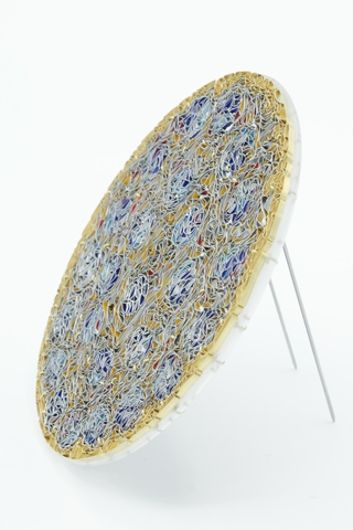 This piece was created for the (Postponed) China International Contemporary Metal Art Exhibition and reflects my fascination with the transformative potential of precious and non-precious materials, merging traditional and experimental approaches while celebrating connections between place, culture and friendships formed through international exchange. Inspired by the spontaneity of single line drawings, it is composed of interlaced ribbon-like gold and aluminium ‘thread,’ with flashes of colour from meticulously sliced and reconstructed cans of Chinese Snow Beer (雪花啤酒) and Tennent’s Lager.