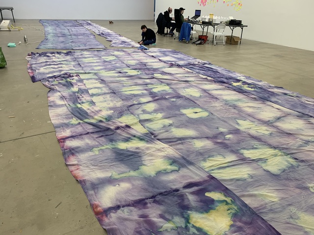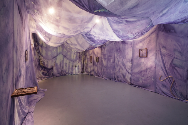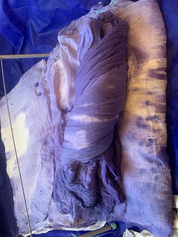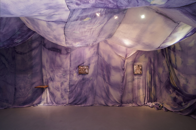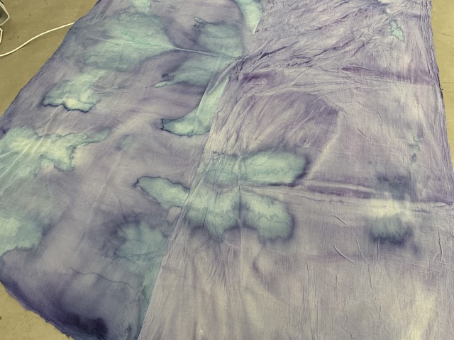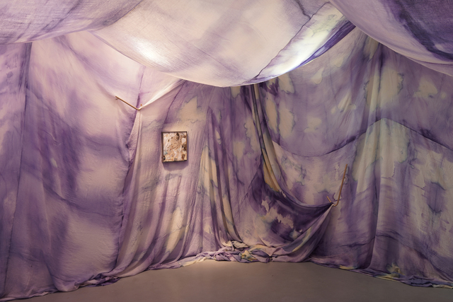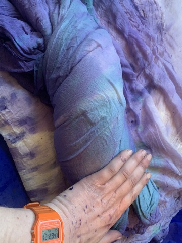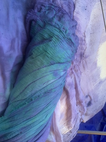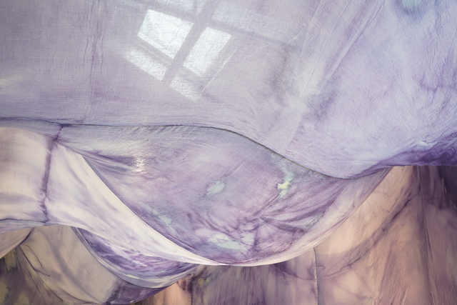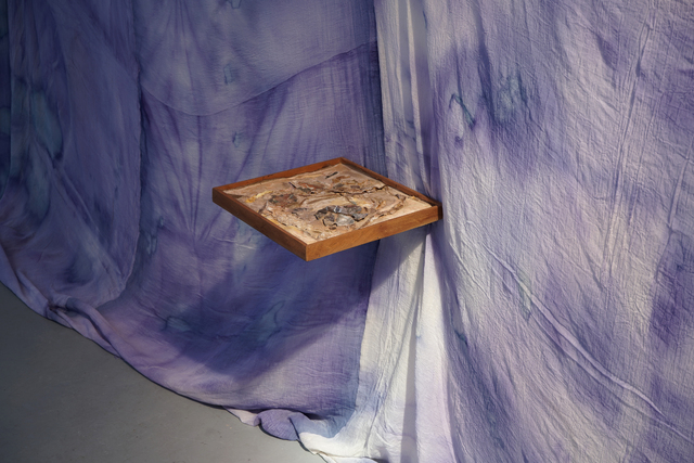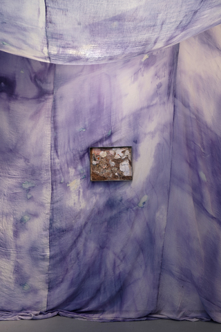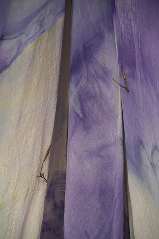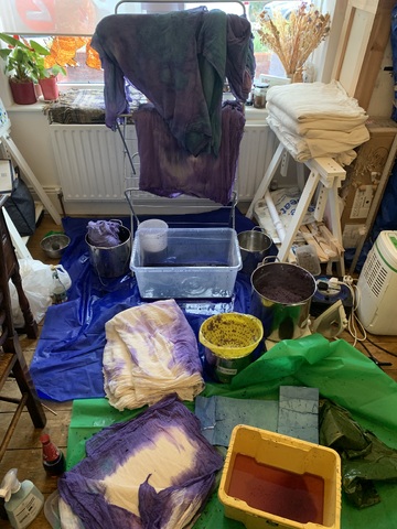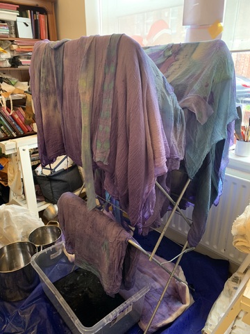 Chora is a collaborative RDF funded enquiry between Sara Barker and Rosie Morris investigating immersive installations and intimate objects as membranes of a ruined body, archiving and transmitting tacit, and complex knowledges of care. The projects first iteration is a new collaborative public installation for 36 Gallery, Newcastle, serving as an artistic encounter and host to engagement activities. As collaborators we draw on feminist spatial theory (Kristeva, Irigaray, Grosz), ecofeminist material intra-action and polyphony (Barad, Wall Kimmerer, Bakhtin, Ozeki, Cuddon), contemporary research into felt-knowledge and co-authorship (Springgay; Brand; Pallasmaa, Gale & Larkin), and archaeological research into neolithic tombs and kinship. Our installation investigates this as a porous, relational architecture (Ebling) —a container that behaves like a living or ruined body (Bachelard, Sasraku): a host, a skin, a shelter, a site of memory. The resulting artwork forms a semi-translucent suspended muslin painting you walk into and around created by Morris, alluding to a womb, tomb or shrine. Placed inside at child-heights, in folds, and as drawers Barker’s works resemble votives, field-trays, archaeological fragments, sifted through and pushed into corners. Sally Pilkington’s 5:1 commissioned sound further intensifies space of comfort, introspection and dissonant dialogue with human and more-than-human bodies. Morris’s methods of production are material and relational rather than representational, rooted in the embodied experiences of familial domesticity and reciprocity with the more-than-human. Acting as proxy or shroud for the human body, its size demands an enactment of arduous domestic labour: time spent grappling, folding, souring, mordenting, bathing and stitching. These actions are archived: red cabbage shibori-dye emphases bed-sheet-scale folds and creases, modifiers of soda crystals and vinegar alchemise colour, printing gestural traces of wringing, smearing and mopping. These actions set in motion a continuing a material intra-action between leaky, decaying, and digestive more-than-human-bodies, as materials drip and hang to dry, further interacting with heat and light. The fabric’s form is bodily, mammalian (breast-like), and intestinal, echoing neolithic tombs and sarcophagi references to the body, kinship, and flesh-eating. There is a post-human flow (Fowler, Ingold) as objects destabilise to become material and relational: fabric bulges and wafts, revealing tensions between fluidity and solidity, further complicated in dialogue with Barker’s lyrically placed ‘Supports’ and at times transparent assemblages which frame, pinch, press, pierce, protrude, gather and conceal. |